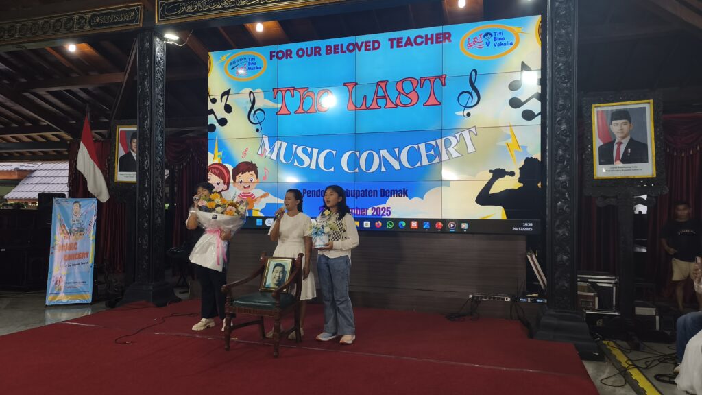 Konser akhir yang telah lama direncanakan—bahkan sempat tertunda—akhirnya tetap berlangsung. Pada Sabtu, 20 Desember 2025, pukul 13.00–17.00 WIB, di Pendopo Kabupaten Demak, sekitar 50 siswa didik Kak Titi yang tergabung dalam Titi Bina Vokalia dan Titi Bina Musika menampilkan kemampuan mereka dalam bernyanyi dan bermain musik dengan tajuk “Last Concert Music-For Our Beloved Teacher”.