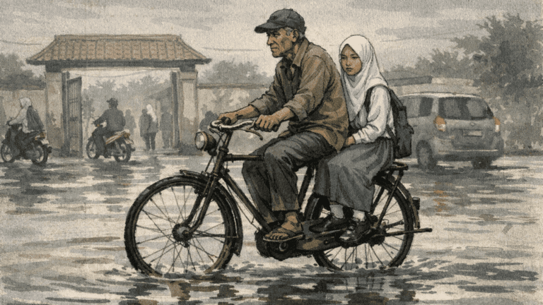Pada saat itulah aku melihat pemandangan yang indah sekaligus mengusik. Seorang gadis berkerudung putih, berseragam putih abu-abu, dibonceng seorang lelaki tua dengan sepeda kayuh yang sudah berkarat. Wajah si gadis datar saja. Wajah lelaki yang memboncengkannya kaku. Aku tidak mendengar apa pun, tetapi membayangkan suara rantai sepeda yang berputar dan napas sang bapak yang keluar-masuk lewat hidungnya.